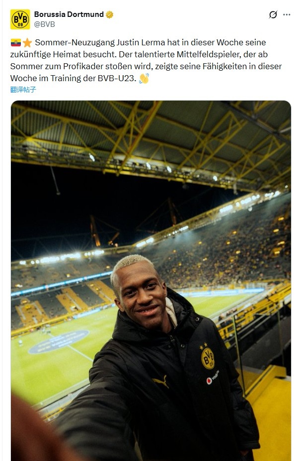 1月16日讯 多特社媒晒图,已敲定的17岁新援贾斯汀·勒马在本周提前造访了俱乐部。
