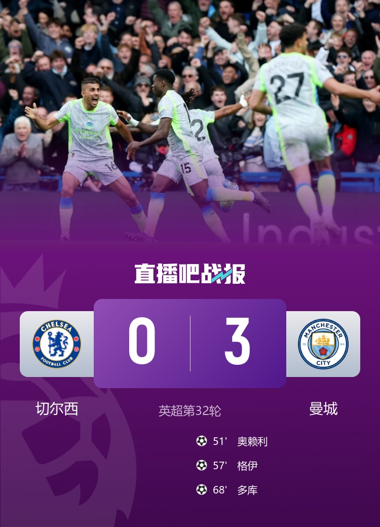 曼城少赛一轮落后榜首6分!切尔西落后欧冠区4分;谢尔基2助,奥赖利进球后伤退,多库、格伊建功。