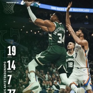 雄鹿发布字母哥数据海报:全场19分14板7助,队内最佳球员!